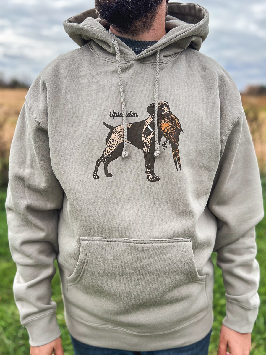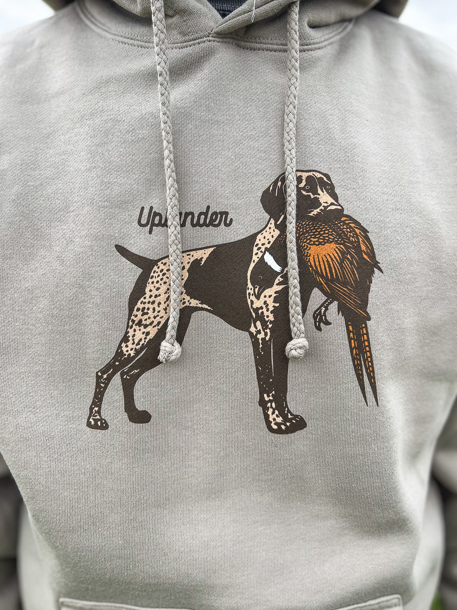 Dead Bird, Fetch! German Shorthair Pointer retrieving a pheasant on an ultra comfortable heavy weight hoodie.